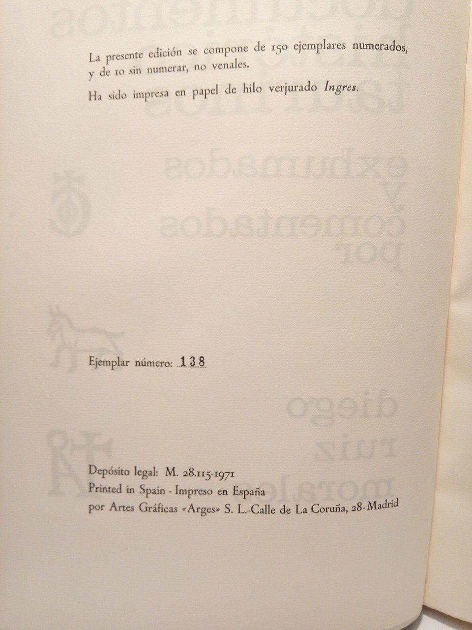 [PRIMERA EDICION].- Madrid: Artes Gráficas "Arges", 1971.- 156 p., [1 h.]: Ilustrado con algunos documentos facsímiles; Folio Mayor (32,4 x 24,2 cm); Magnífica impresión sobre papel de hilo verjurado de gran calidad; Finamente encuadernado en Media Piel chagrén, Lomo dorado con filetes y florones en pan de oro auténtico, cabeza (o corte superior) tintado en color granate, conserva las cubiertas originales.- Edición de 150 ejemplares numerados, impresos sobre papel Ingres (de hilo) de la Casa Guarro, siedto este el Nº 138. MUY RARO.* Excelente estado, como nuevo. TAUROMAQUIA