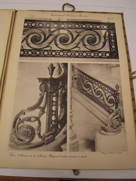 Due cartelle di cm. 45, ciascuna con frontespizio ed una carta d'indice seguiti da 80 belle tavole complessive. Cartelle edit. in mezza tela con laccetti di chiusura. Ottimo stato di conservazione. Interessante raccolta di esempi riguardanti lavori antichi eseguiti in ferro. Disponibili la prime e seconda serie.