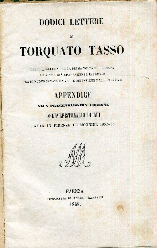 Dodici lettere di Torquato Tasso, delle quali una per la prima volta pubblicata, le altre gia sparsamente impresse, ora di nuovo cavate da mss. e qui insieme raccolte come appendice alla pregevolissima edizione dell'epistolario di lui fatta in Firenze Le Monnier 1852-53 | Libri antichi e moderni | Tasso, Torquato, ,Tasso, Torquato