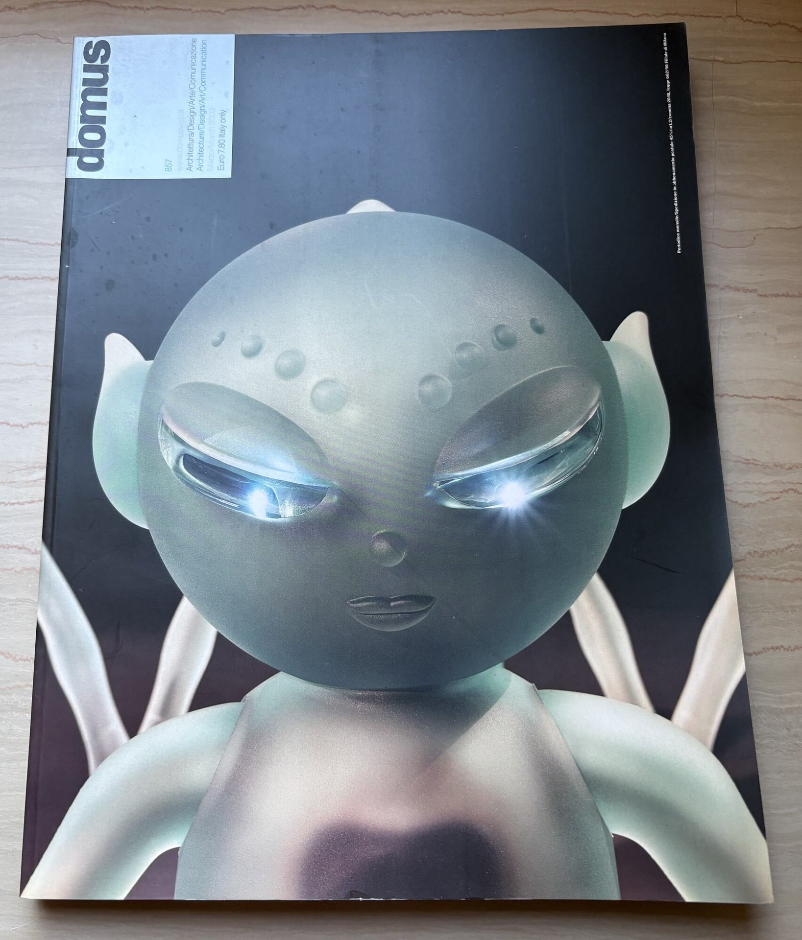 I ed. della rivista mensile: marzo 2003 numero 857 (Via Gianni Mazzocchi 1/3, Rozzano - Milano). Testi in italiano/inglese. IV/(68)+XXIX arredobagno/impianti/bathroom furnishing/fixtures+(5)+(2)+136=240/brossura satinata (Copertina/ Cover: L'alieno di Mariko Mori, creato insieme all'astronave spaziale per la mostra itinerante in partenza da Bregenz per un giro del mondo, o forse della galassia. Foto di Red Saunders/ Mariko Mori's Alien created, along with protype flyng saucer, for her new touring exhibition that opened in Bregenz before embarking on its tour of the world, if not the galaxy. Portrait Red Saunders). Con rassegna Il sogno della casa-robot/The dream of a house robot. Art Director: Giuseppe Basile. Stato buono.