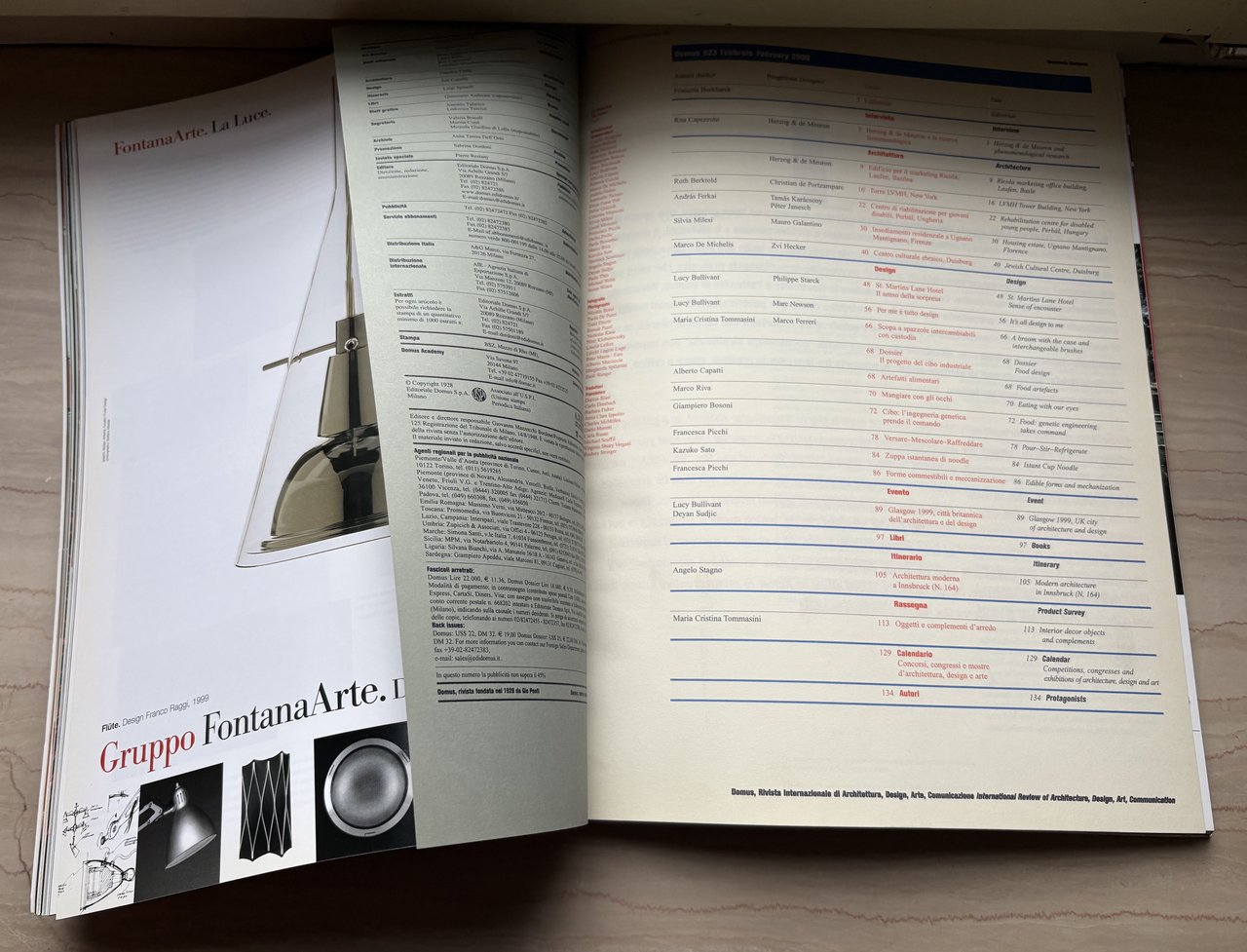 • periodici, arte, Zush, architettura, Mauro Galantino Insediamento residenziale bugnano Mantignano , Itinerario 164 Architettura moderna a Innsbruck, architettura degli interni, design, Food Design, Rassegna oggetti e complementi d''arredo, François Burkhardt, grafica, Giuseppe Basile, domus N. 823 Febbraio/February 2000