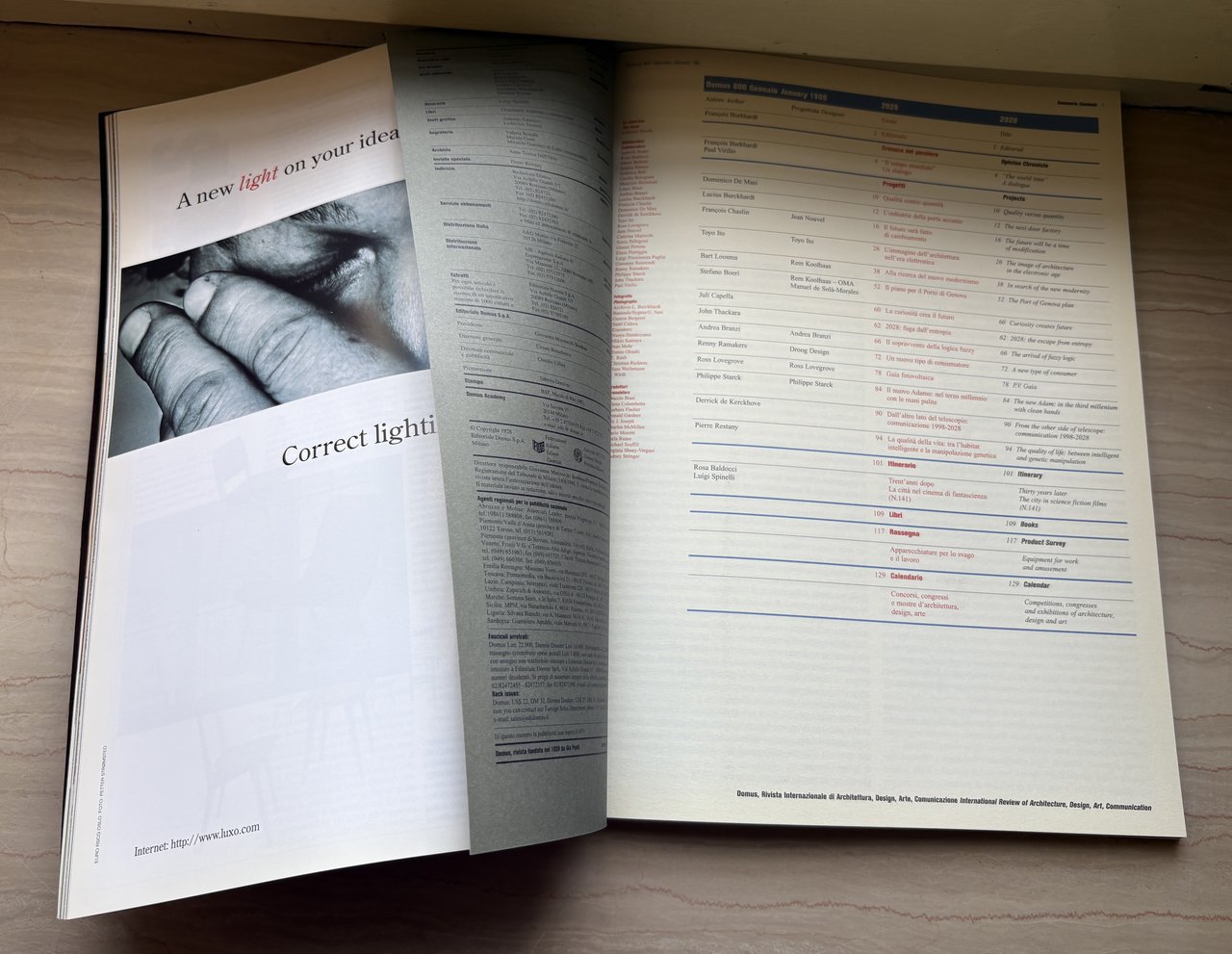 I ed. della rivista mensile: gennaio 1998 numero 800 - 2028 2028 (Via Achille Grandi 5/7, Rozzano - Milano). Testi in italiano/inglese. IV/(52)+132 anche ripiegate=184/brossura satinata (La Copertina/ The Cover: Lebbeus Woods, 2028/2028). Illustrazioni in nero, b/n e a colori. Grafica/Graphics: Giuseppe Basile. Stato buono (leggera usura della copertina ai margini - volume nel complesso leggermente brunto).