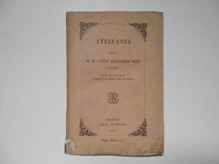 M. A. F. Doni, Attavanta Villa Felice Le Monnier, Firenze, 1857. Cm. 16,5x11; pp. 79. Cartoncino edit. marrone. Condizioni di conservazione Esemplare in ottimo stato di conservazione. Lievi macchiette all'angolo inf. destro del fronte della coperta. Alcuni aloni di gora alle pagg. interne. SETT161.L23377G P
