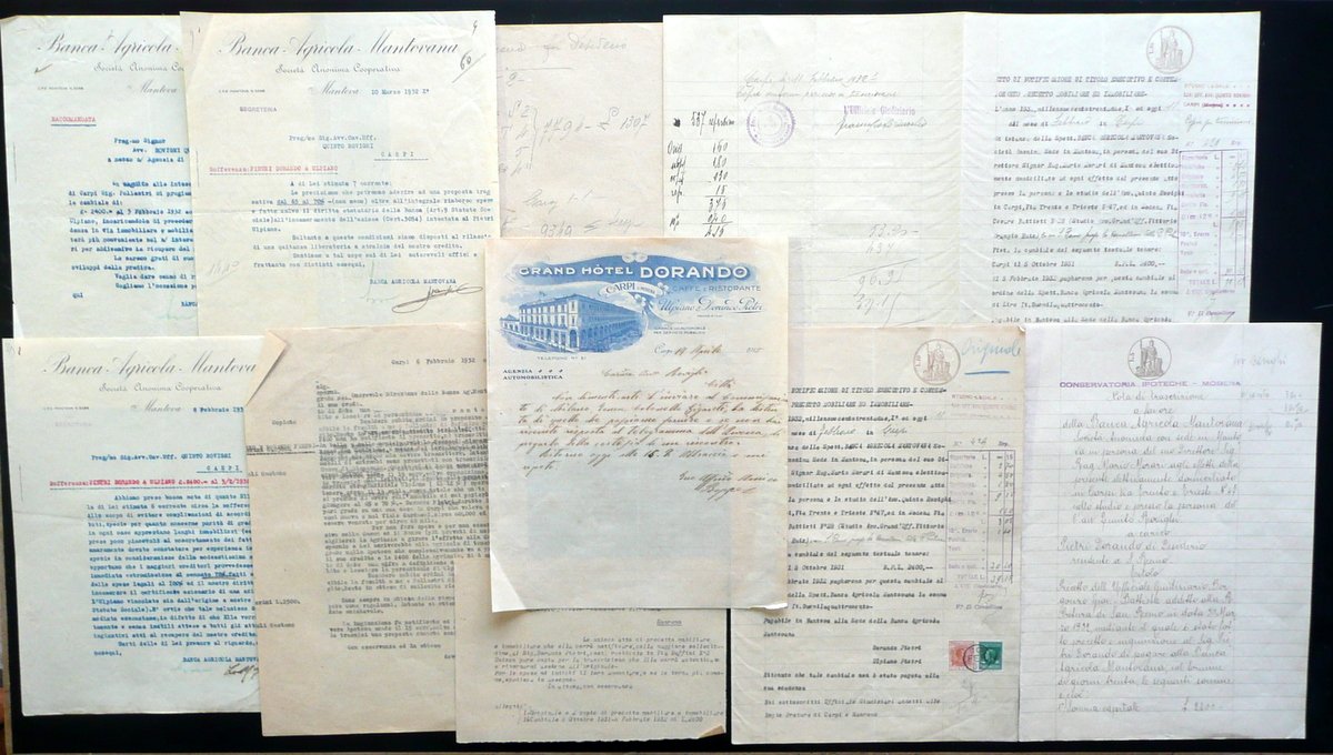 Carteggio (fattura, atti di notificazione e ipoteche, ecc.), Dorando e Ulpiano Pietri carteggio manoscritto e dattiloscritto fattura del Grand Hotel Ulpiano e Dorando Pietri di Carpi, due atti di notificazione, una nota di trascrizione (ipoteca), ecc. 1915 - 1932 Carteggio dattiloscritto, manoscritto e a stampa di varia natura, comprendente documentazione datata entro il periodo 1915-1932; presente anche una fattura del Grand Hotel Ulpiano e Dorando Pietri di Carpi, con bella intestazione a colori. Atti e documentazione con timbri, firme e mache da bollo per convalida. Cm circa 30,5x21. Condizioni di conservazione Carteggio ben conservato con tracce d'uso, leggere tracce di pieghe di conservazione, qualche minuscola brunitura e minimi lievissimi accenni di sporco; margini e angoli di qualche foglio con alcuni piccoli strappetti e pieghette / tracce di pieghette. Interessante carteggio che bene illustra le difficoltà economiche in cui si ritrovò a versare il celebre maratoneta carpigiano Dorando Pietri. SC03.D13457 N