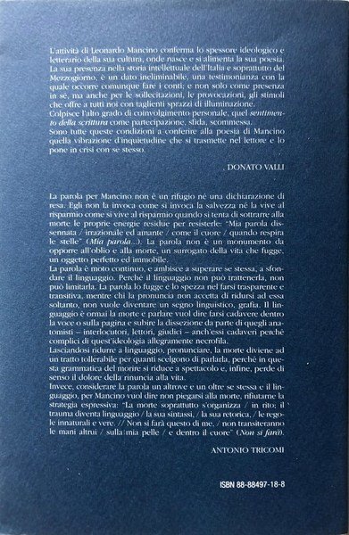 Soggetti: Letteratura italiana, Testi, Poesia contemporanea, Poeti contemporanei, Raccolte poetiche, Antologie, Libri fuori catalogo, Libri rari, Utopia reale, Novecento, Pugliesi, Bari, Marche, Marchigiani, Gruppo anconitano, Anni Sessanta, Piersanti, D’Elia, Pagnanelli, Garufi, Scataglini, Scarabicchi, Raffaeli, De Signoribus, Alvaro Valentini, Plinio Acquabona, Germana Duca, Puglia, Rivista Ciminiera, Filippo Davoli, Marcorè, Madre, Le virtù, le occasioni, le cose, Sono stato, Vidi Le Città, Significando L’antica Casa, Mattino D'autunno A Marciana, Lasciate Che I Folli, Per Karl Jaspers, Pomeriggio deserto, Paura di morire, Pensieri, Terra, Sogno, Estate vicina, Floriana sposa di maggio, Opere, Saggistica, Intellettuali, Mezzogiorno, Mia parola, Oblio, Morte, Inquietudine, Passione, Anni Settanta, Anni Ottanta, Anni Novanta, Italian literature, Texts, Contemporary poetry, Contemporary poets, Poetic collections, Anthologies, Books out of print, Rare books, Royal Utopia, Twentieth century, Ancona group, Sixties, Seventies, Eighties, Mother, Autumn morning, Deserted afternoon, Fear of dying, Thoughts, Earth, Dream, Summer near, Works, Nonfiction, Intellectuals, Noon, My word, Forgetfulness, Death, Restlessness, Passion, Nineties