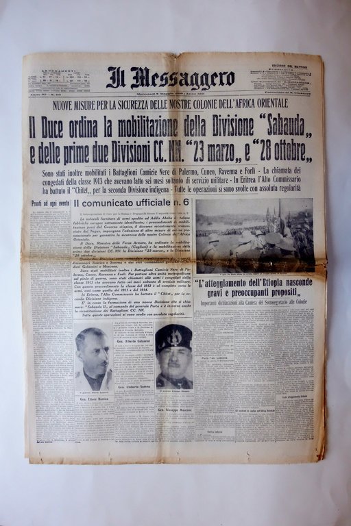 Giornale, Il Duce ordina la mobilitazione della Divisione 'Sabauda' e delle prime due Divisioni CC. NN. '23 marzo' e '28 ottobre' " in "Il Messaggero" anno 57 - numero 110 Roma, 8/5/1935 Roma 1935; cm 59,5x44; pp. 10 con ill. in b/n. Numero completo. Condizioni di conservazione Buone condizioni con tracce d'uso, pieghe di conservazione, leggero ingiallimento dovuto al tipo di carta. Minimi strappetti ai margini e alle pieghe conservative. Angoli lievemente sgualciti. Per ulteriori dettagli vedi foto. Completo. SETT206.L24216 N "