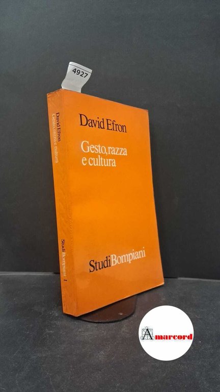 665 Efron, David Efron, David. , and Spada, Michelangelo. , Veen, Stuyvesant : van. Gesto, razza e cultura : indagine preliminare su alcuni aspetti spazio-temporali e linguistici del comportamento gestuale di ebrei orientali e italiani meridionali abitanti a New York in condizioni ambientali sia simili che differenti. Milano Bompiani, 1974. , Bompiani 1974 italiano, in ottavo -- 4927