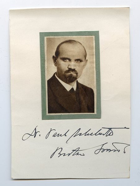1 S. 8vo. Mit alt montiertem Portrait (Zeitungsausschnitt) und alt auf Trägerpapier montiert. Dr. Paul Schebesta | Besten Dank. - Paul Schebesta wurde nach Empfang der Priesterweihe 1911 als Mitglied der Steyler Missionare nach Moçambique entsandt, wo er während des Ersten Weltkriegs interniert war. Seit 1921 Dozent im Missionshaus Maria Enzersdorf am Gebirge (Niederösterreich), widmete er sich ethnologischen Studien und unternahm Forschungsreisen nach Malaysia (1924/25) und auf die Philippinen (1938/39). Seit den dreißiger Jahren beschäftigte er sich vor allem mit den Pygmäen Zentralafrikas, deren Lebensverhältnisse er auf insgesamt vier Expeditionen (1929, 1934/35, 1949/50, 1954) erkundete; seit 1947 unterrichtete er an der Wiener Hochschule für Welthandel. Vgl. Öst. Lex. II, 340f.