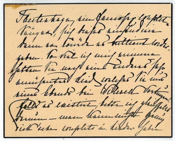 2 SS. Qu.-8vo. An Gustav Pick: "Haben Sie noch Exemplare von Ihrem Liede 'Der Tanz-fex'? Wenn ja, darf ich Sie um ein Solches bitten […] So viel ich mich erinnere hatten Sie noch ein anderes sehr amüsantes Lied welches Sie uns eines Abends bei Wilesek vortrugen. Falls es existiert bitte ich gleichfalls darum - man kann nicht genug Pick'sche couplets u. Lieder haben […]". - Für eine Wohltätigkeitsveranstaltung der Fürstin Pauline von Metternich anlässlich des hundertjährigen Bestehens der Fiakerzunft im Mai 1885 komponierte Gustav Pick (1832-1921) das berühmte Fiakerlied, welches der Schauspieler Alexander Girardi, der als Höhepunkt dieses Praterfestes auftrat, zum Besten gab. Dieses Lied machte Pick schlagartig bekannt. - Auf Briefkarte mit gedr. Adresse und schwarzem Trauerrand.