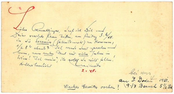 1 S. Qu.-schmal-8°. An Friedrich Qualtinger, den Vater Helmut Qualtingers: "Darf ich Dich und Deine verehrte Frau bitten, am Freitag d. 6/VII in die Secession (Getreidemarkt) zu kommen, ½ 8h abends? Ich werde dort sprechen und lesen, zum ersten Mal seit vielen Jahren in Wien! Ich mein', ihr sollt da nicht fehlen [.]". - Papierbedingt leicht gebräunt und gering fleckig; mit einer kleinen Notiz a. d. H. d. Adressaten.