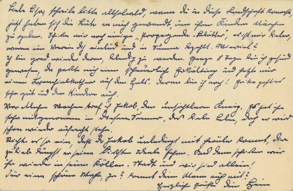1 S. Qu.-8vo. Mit eh. Adresse. An die Schriftstellerin Lisa Tetzner (1894-1963): "Schreibe bitte allsobald [!], wenn Du in diese Landschaft kommst, jetzt haben sich die Leute an mich gewandt, um ihren Kindern Märchen zu geben. Schicke mir noch einige 'Propaganda-Blätter', es ist mir lieber, wenn ein Verein Dich einläd [!] und in Summa bezahlt. Wieviel? Ich bin grad wieder daran, lebendig zu werden. Ganze 8 Tage bin ich gesund gewesen, da packte mich eine schauerliche Erkältung und setzte mir und setzte mir einen Bronchialkatharr [!] auf den Hals. Daran bin ich noch. Erika geht es sehr gut und den Kindern auch [.]".