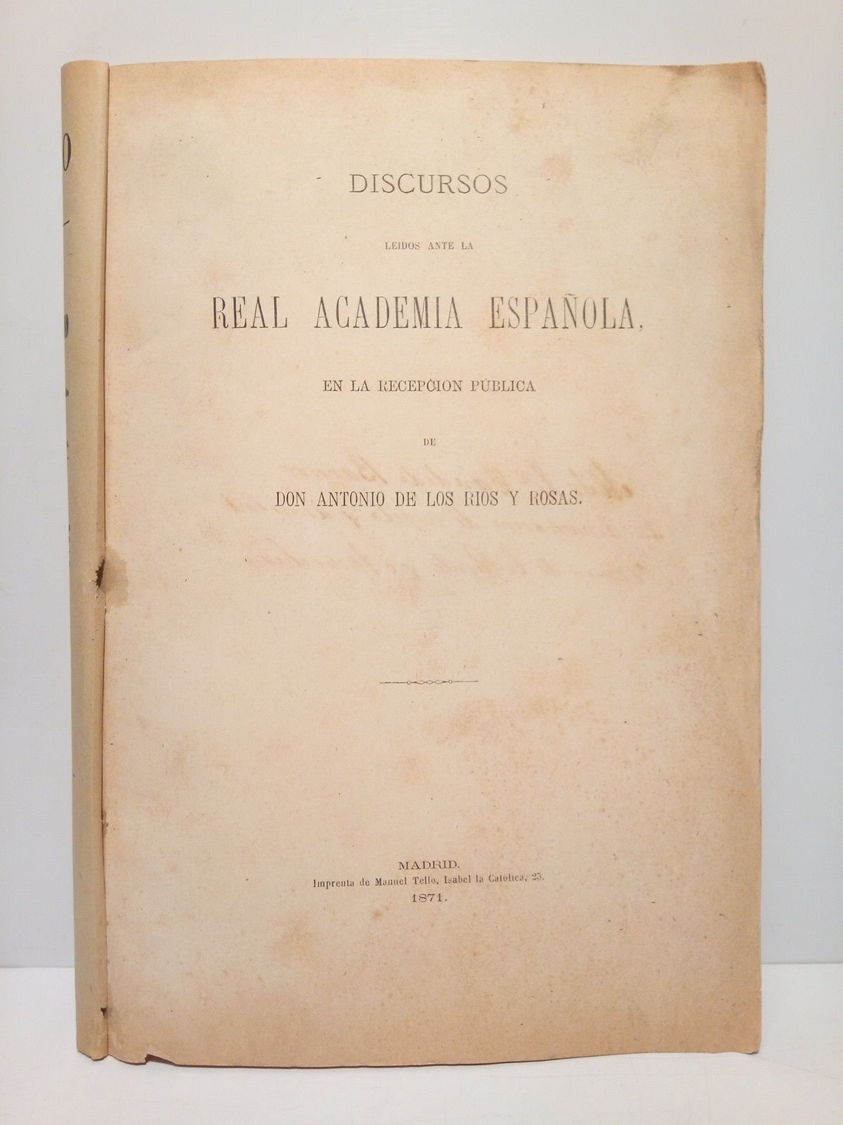El génesis, la naturaleza, lavida del principio de autoridad en el orden literario. (Discurso de ingreso en la R. Academia Española. CONTESTA: D. Fermín de la Puente y Apezechea) | Libri antichi e moderni | Rios Y Rosas, Antonio De Los