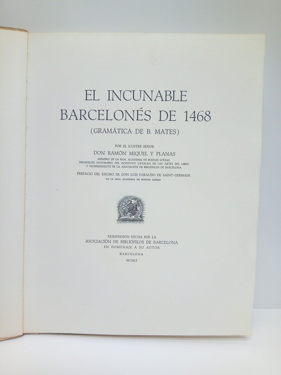 El incunable barcelonés de 1468 (Gramática de B. Mates) / Por el Ilustre Señor Don Ramón Miquel y Planas; Prefacio del Excmo. Sr. Don Luis Faraudo de Saint-Germain