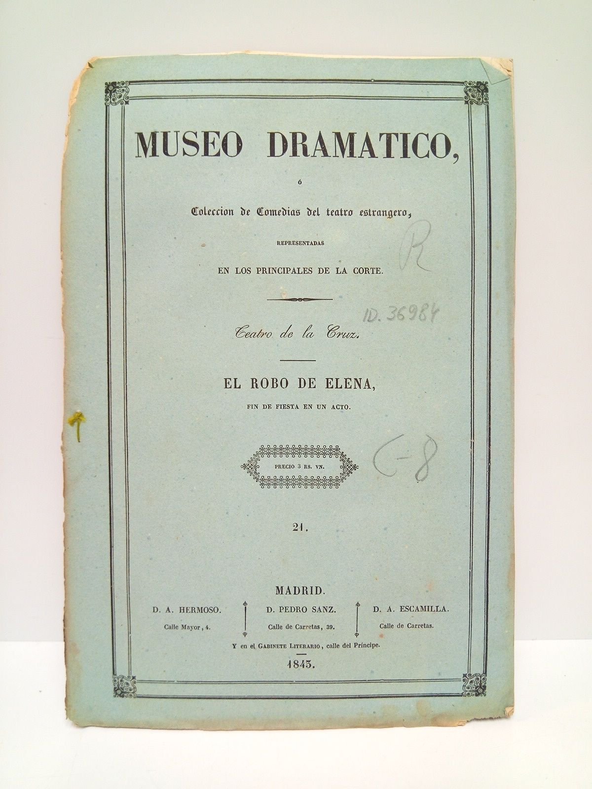 1ª Ed. española.- Madrid: Museo Dramático (Imp. de D. F. Suárez), 1843.- 13 p.; 4º mayor (25,2 cm); Impresión a dos columnas; Cubiertas originales.- (Museo Dramático. Colección de Comedias del teatro estrangero. Nº 21).* Las cubiertas ligeramente fatigadas. Esquina superior interna algo desgastada. TEATRO ESPAÑOL DE LOS SIGLOS XIX-XXI