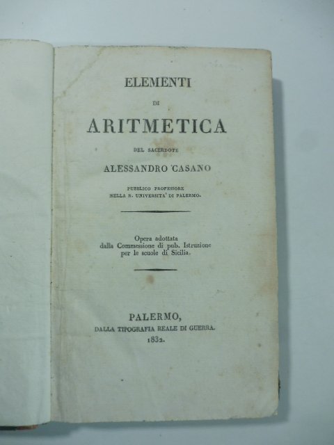 Elementi di aritmetica del sacerdote Alessandro Casano pubblico professore nella R. Universita' di Palermo. Opera adottata dalla Commessione di pubb. istruzione per le scuole di Sicilia | Libri antichi e moderni | Casano Alessandro