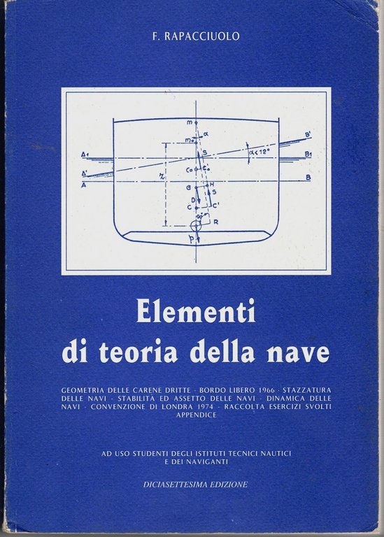 ELEMENTI DI TEORIA DELLA NAVE di F. Rapacciuolo ad uso studenti degli Istituti Tecnici Nautici e dei NavigantiTipografia Moderna, Diciassettesima Edizione 2001.437 Pagine illustrazioni in bianco e nero nel testo e 3 tavole sciolte più volte ripiegate a fine volume. Copertina editoriale in brossura. Stato di conservazione: molto buono (pagine normalmente ingiallite).
