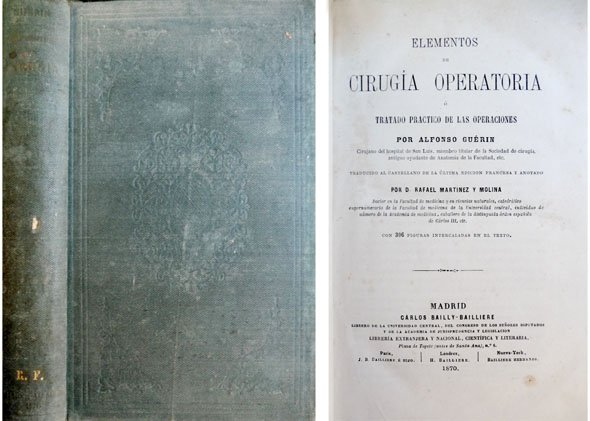 Madrid, Carlos Bailly-Baillière, Librero de la Universidad Central, 1870. 4to.; 2 hs., 582 pp., con 306 ilustraciones entre el texto. Encuadernación en tela estampada, de la época. El traductor, Rafael Martínez Molina (1816-1888), Catedrático de Anatomía y Doctor en Ciencias Naturales, fue un personaje clave en la introducción en España del 'método experimental' a través del avanzado "Instituto Biológico", creado por él y que devino el núcleo español de investigación más importante de su época. Fue asímismo un notable cirujano, de lo que da buena prueba ésta temprana traducción de Guerin, el descubridor de la génesis de la septicemia y renovador de los métodos operatorios por la introducción de modernos procedimientos antisépticos.