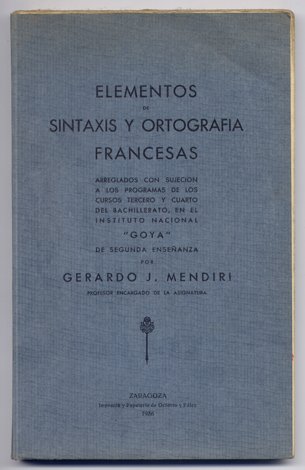 Elementos de Sintaxis y Ortografía Francesas. Con arreglo a los programas de los cursos Tercero y Cuarto del Bachillerato en el Instituto Nacional "Goya" de Segunda Enseñanza. | Libri antichi e moderni | Mendiri, Gerardo J.