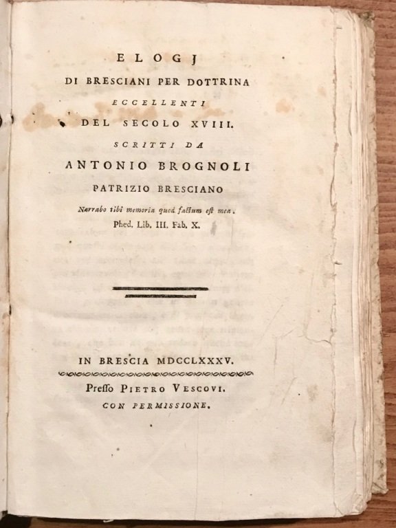 Elogj di bresciani per dottrina eccellenti del secolo XVIII. | Libri antichi e moderni | Brognoli Antonio.