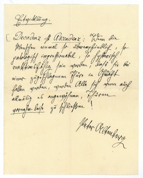 1 S. Gr.-4to. Decadenz ist Ascendenz: Wenn die Menschen einmal so überempfindlich, so patologisch impressionabel, so hysterisch reaktionsfähig sein werden, daß sie bei einer zugeschlagenen Thüre in Ohnmacht fallen werden, werden Alle sich wenn auch allmälig es angewöhnen, Thüren vornehm-leise zu schließen!