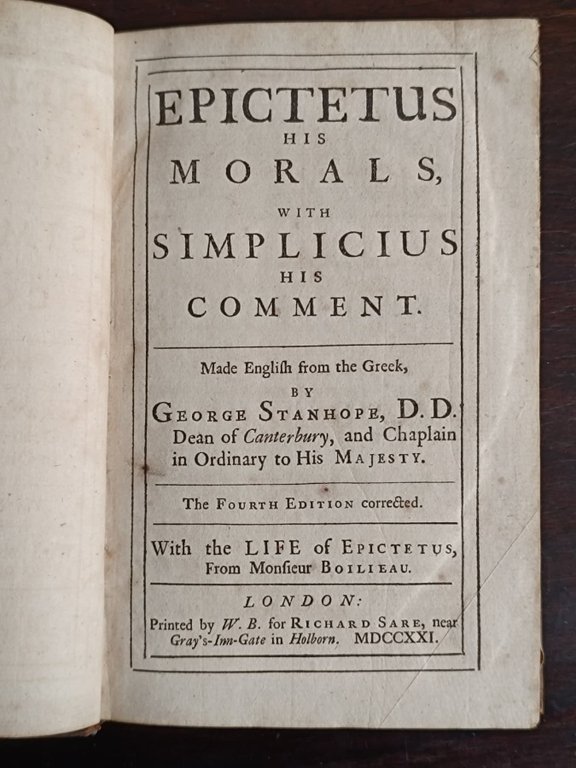 In-8° (cm. 19), legatura coeva in pieno vitello, piatti inquadrati da triplice cornice a secco di filetti impressi con angolari e fregi floreali che fiancheggiano quella più interna, dorso a nervi (minime tracce d'uso), labbri ornati in oro, tagli spruzzati in rosso; pp. [12] XXXIV [4] 337 [5] in stato molto buono; alcune fioriture, strappo senza perdite alla c. A4, antica firma di possesso al contropiatto. Traduzione non comune in inglese a cura di George Stanhope delle opere di Epitteto. L'opera presenta gli insegnamenti morali del filosofo e un breve brano biografico tratto da Boilieau, con il commento di Simplicio, filosofo neoplatonico. Buon esemplare. (NP6)