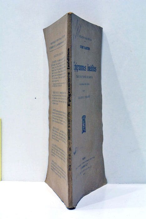 48 pages. 3 feuillets. Ornements hors du texte. (18,5x12cm). Broché. Couverture impirmée brunie. Quelques salissures et maruqes de stylo sans importance. Coins et dos légèrement émoussés. Sinon bien relié. Publié à Paris en 1904, cet ouvrage rassemble des épigrammes inédites de Bussy Rabutin, traduites ou imitées de Martial, offrant ainsi un aperçu fascinant de la littérature française du XVIIe siècle à travers le prisme de l'Antiquité. L'édition, soigneusement préparée d'après les manuscrits de la Bibliothèque Nationale, est enrichie d'un avant-propos et de notes par un bibliophile anonyme, témoignant de l'érudition et de l'intérêt pour les textes anciens de l'époque. Pages brunies avec quelques petites taches éparses sans gravité. Ornements hors du text. Bien conservé.