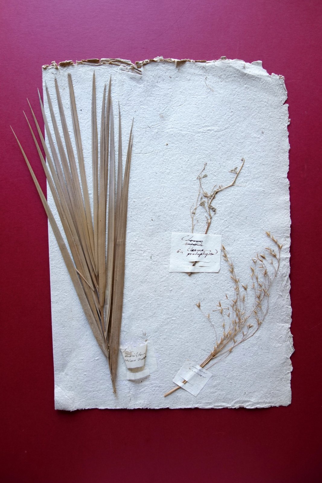 Pagina di antico erbario, Pagina di antico erbario con applicati tre campioni di piante Palma da datteri - Cleone pentaphylla - Cynosurus echinatus metà Ottocento circa S. d. (metà Ottocento circa); pagina di antico erbario in carta uso mano con applicati tre campioni di piante essiccate, corredati da targhetta descrittiva d'epoca, manoscritta (vedi foto). Retro bianco. Cm 43x30,5. Condizioni di conservazione Esemplare in buone condizioni con leggeri segni del tempo; palma da dattero staccata dalla pagina (vedi foto). Angolo superiore della pagina con una piccola mancanza. Per maggiori dettagli vedi foto. INC.0079 N