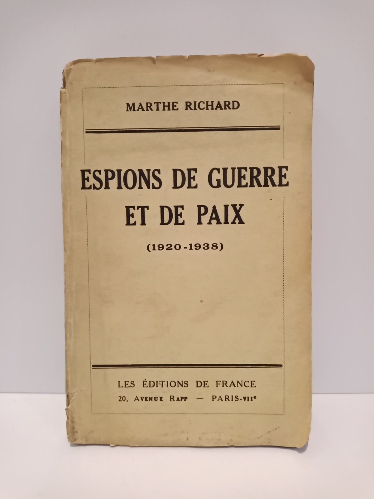 Paris: Les Editions de France, [ca. 1938].- [3 h.], 211 p.; 8º (18,6 x 12 cm); Texto en francés; Rústica Ed.* Las cubiertas algo fatigadas, con una falta en la cabeza del lomo. ESPIONAJE