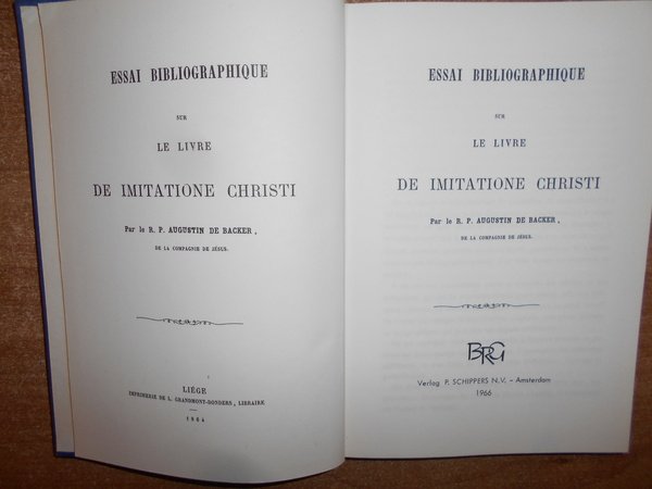 AUGUSTIN, BACKER. Amsterdam, Verlag P. Schippers N.V., 1966. Essai Bibliographique sur le livre DE IMITATIONE CHRISTI. In-8° piccolo, tela bleu con titoli in oro sul piano e al dorso. viii, 257, (1) pp. Perfetto esemplare. Uff. E - IV - 3 - 2