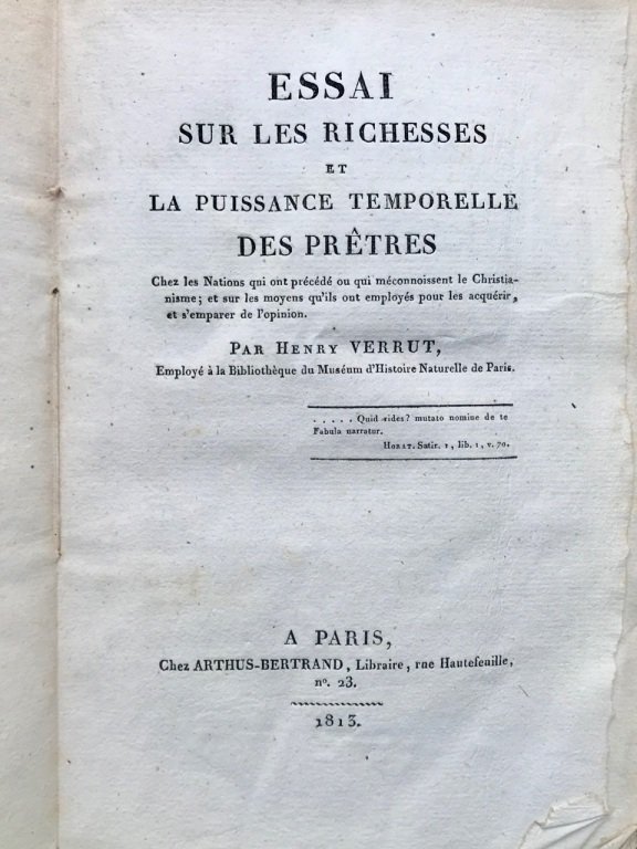 Essai sur les richesses et la puissance temporelle des pretres chez le nations qui ont précédé ou qui méconnoissent le Christianisme [.] | Libri antichi e moderni | Verrut Henry.