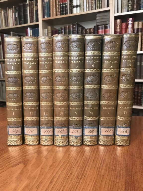 <font face="Arial, Verdana" size="2">[UNITO A]: Charron Pierre, <i>De la Sagesse</i>, A Paris, chez Chassériau, 1820-1821. - 8 volumi in-8° (cm. 21,1), eleganti legature coeve in mezza pelle con titoli in oro e decorazioni in oro e a secco ai dorsi (piccoli segni d'usura), tagli spruzzati, carte in ottimo stato con sporadiche fioriture, 2 tavole di ritratto incise in rame all'antiporta f.t. del primo e settimo volume (Montaigne e Charron). Doppio frontespizio ad ogni volume, che riporta il titolo della collana </font><i style="font-family: Arial, Verdana; font-size: 10pt; font-variant-caps: normal; font-weight: normal;">Collection de moralistes francais</i><font face="Arial, Verdana" size="2"> di cui Montaigne è il primo e Charron il secondo (avrebbero dovuto seguire Pascal, La Rochefoucauld, La Bruyère, Vavenargues, Duclos con un programma di 14 tomi ma verosimilmente la collana si fermò). Cfr. Peignot II, 197-198. Ottimo esemplare. [N5]</font>