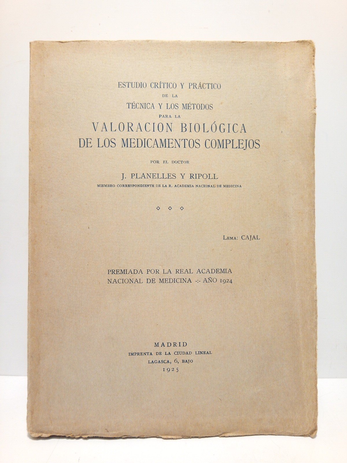 Estudio crítico y práctico de la técnica y los métodos para la valoración biológica de los medicamentos complejos (Premiada por la Real Academia Nacional de Medicina, Año 1924) | Libri antichi e moderni | Planelles Y Ripoll, J.