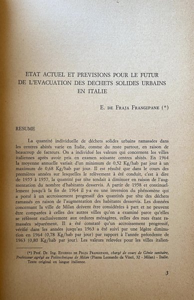 ETAT ACTUEL ET PREVISIONS POUR LE FUTUR DE L'ÉVACUATION DES DÉCHETS SOLIDES URBAINS EN ITALIE | Libri antichi e moderni | Eugenio De Fraja Frangipane