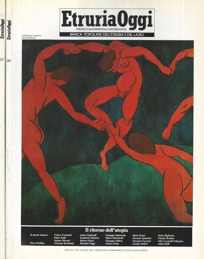 Due numeri dell'anno 1994 di Etruria Oggi - Anno XII n° 36 - 37 Periodico Quadrimestrale d'Informazione. Rivista con copertina in cartoncino lucido in buonissima conservazione, le pagine all'interno ben conservate, il dorso forte, fermo, la legatura stabile. Etruria Oggi n° 36 Numero pagine 80, Etruria Oggi n° 3780 Numero pagine 80.