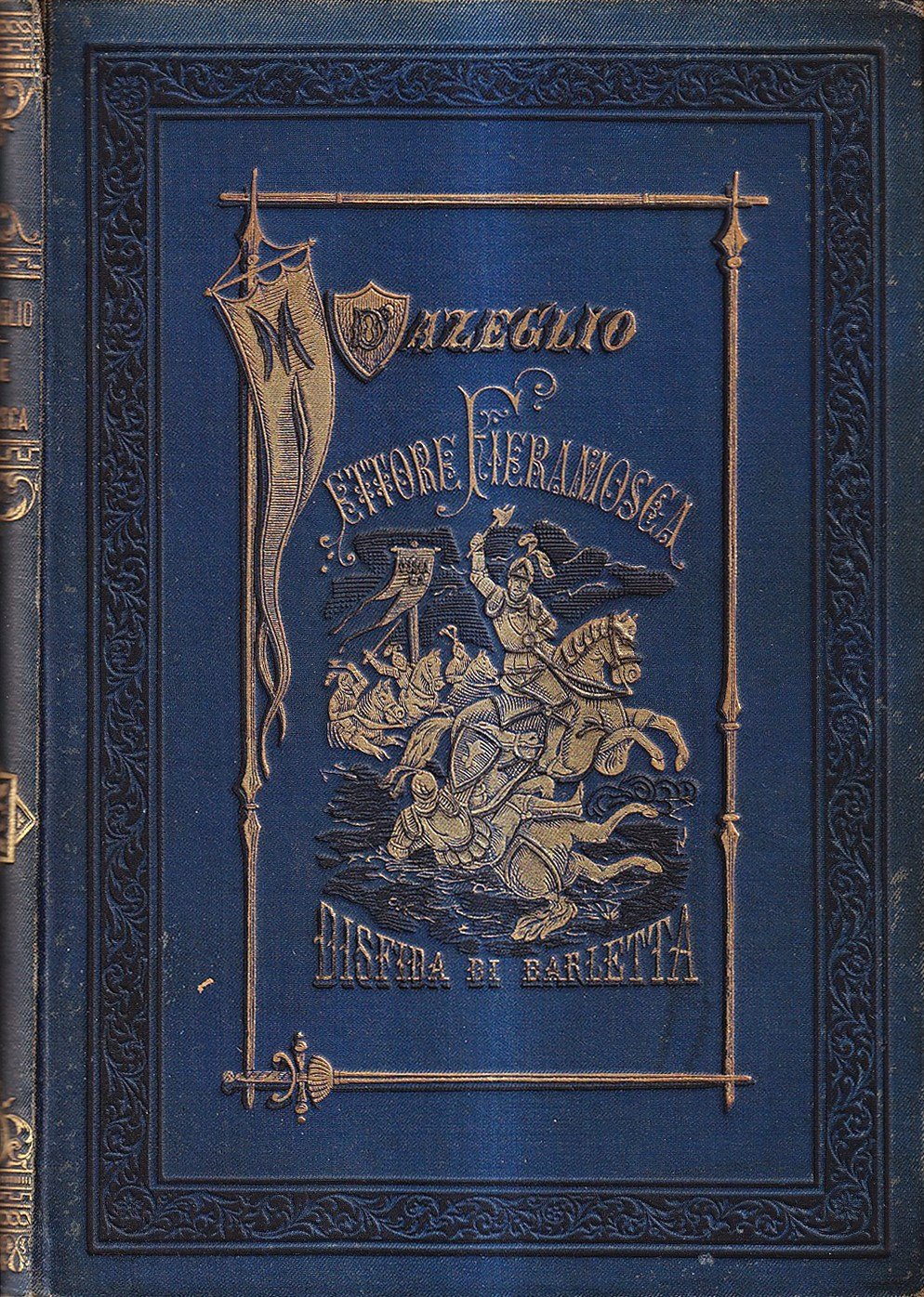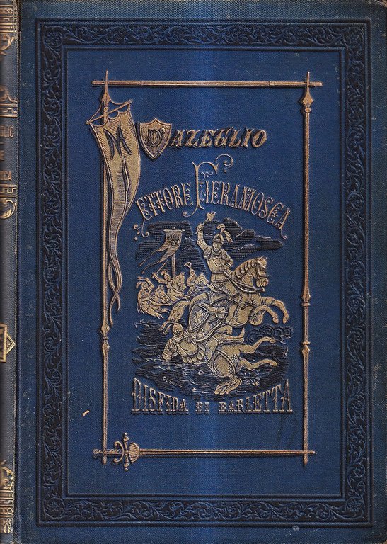 Senza data di stampa, ma post 1865 - Volume rilegato in tela editoriale blu con titolo e illustrazione in oro impressi al piatto, titolo e fregi anche al dorso, 384 pagine con testo incorniciato e incisioni in nero disegnate da Sanesi e incise da Centenari, Gallieri, Mantello, Marabini, Bianchi e altri artisti, ritratto di D'Azeglio in antiporta. Riedizione illustrata del primo e più famoso romanzo storico del D'Azeglio, apparso in prima edizione nel 1833. Con uno scritto introduttivo di Pietro Fanfani su D'Azeglio e i suoi romanzi storici. Carte brunite e con occasionali fioriture, nel complesso bell'esemplare di una pregevole edizione.