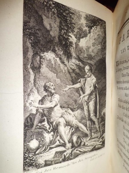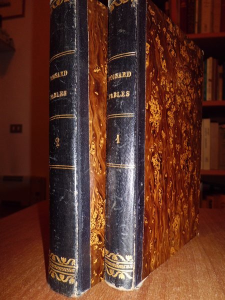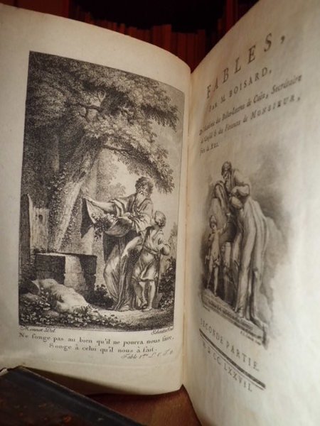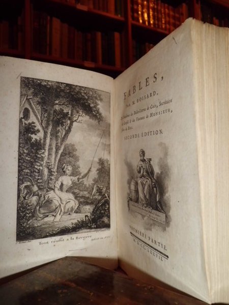 (Favole illustrate) BOISARD, J. - J. - François - Marin. S.L. (Paris), 1777. FABLES, par M. Boisard, de l' Académie des Belles - Lettres de Caen, Secrétaire du Conseil & des Finances de Monsieur, frère di Roi. Seconde édition. 2 volumi in - 8°, m. pelle ottocentesca. 220, (2) pp. e 5 tavole f.t.; 307 pp. e 4 tavole f.t. Il testo è adorno di 2 vignette allegoriche sui frontespizi e le tavole sono incise in rame da E. Schmitz e Saint - Aubin su disegni di C. Monet. Bell' esemplare dell' edizione più pregevole e graziosa. Cohen - Ricci, pp. 171 - 72. Uff. Mob. 13