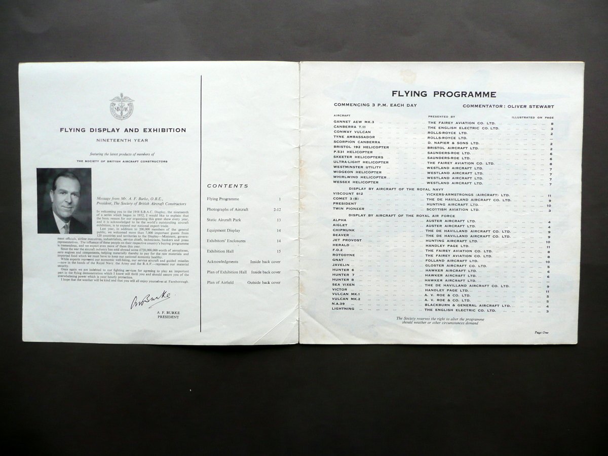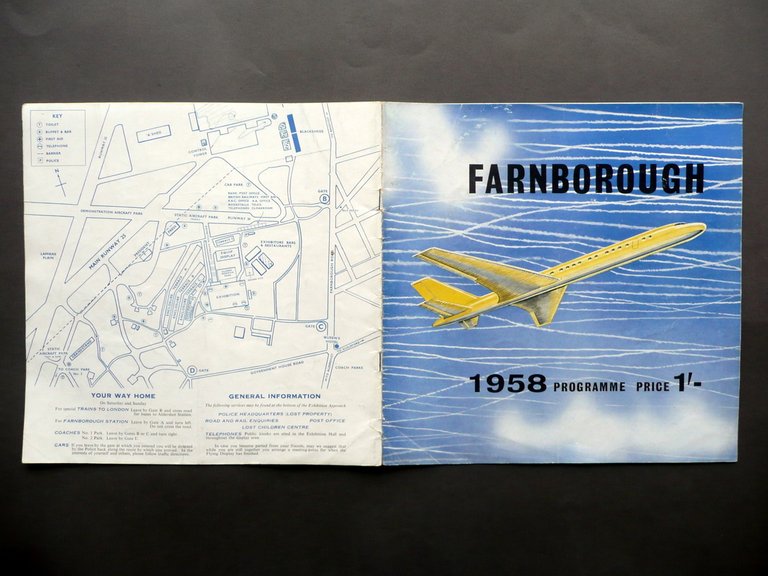 Opuscolo - programma, Farnborough Flying display and exhibition Nineteenth year 1958 Flying programme The Society of British Aircraft Constructors (Published by), London 1958, cm 23x23, pp. 16, con numerosissime ill. in b/n; brossura ed. ill. a colori. Testi in inglese. Condizioni di conservazione: Esemplare in buone condizioni con tracce d'uso; coperta con alcuni minimi difetti e qualche minuscola abrasione; cuffia inf. e parte inf. della brossura post. con uno strappetto di un paio di cm; pochi angoli con qualche lieve traccia di pieghetta. Interni buoni. Opuscolo - programma della diciannovesima mostra ed esposizione di volo di Farnborough, Inghilterra (attualmente esposizione internazionale a cadenza biennale), con numerosissime illustrazioni in bianco e nero di aerei ed elicotteri allora esposti. Testi in inglese. SC03.D11735 N