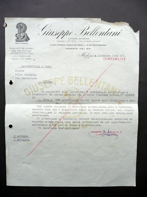 Fattura Giuseppe Bellentani Salumi per Esportazione Modena 4/12/1935 | Libri antichi e moderni |