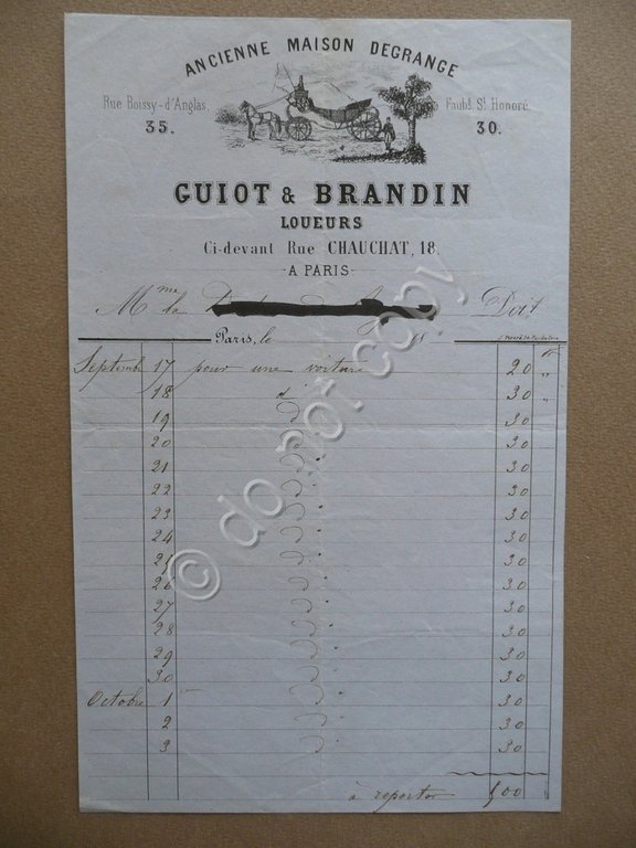 Fattura Guiot & Brandin Loueurs Ancienne Maison Degrange Carrozze Calessi '800