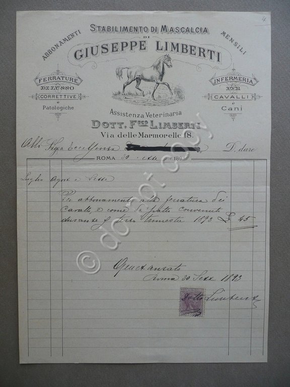 Fattura Stabilimento Mascalcia Giuseppe Limberti Veterinaria Roma 1893 Cavalli