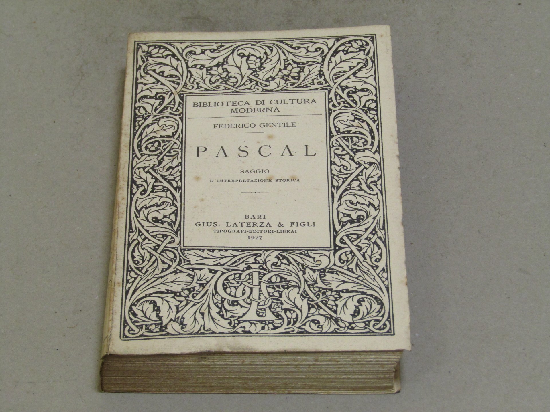 Federico Gentile Federico Gentile. Pascal. Bari, Gius. Laterza & Figli 1927 - I italiano, in ottavo 20 13 pp. 348 Saggio d'interpretazione storica su Pascal. La copertina è un po' usurata ai bordi, presenta delle macchie ed è ingiallita. Le pagine sono ingiallite con qualche macchia e intonse.