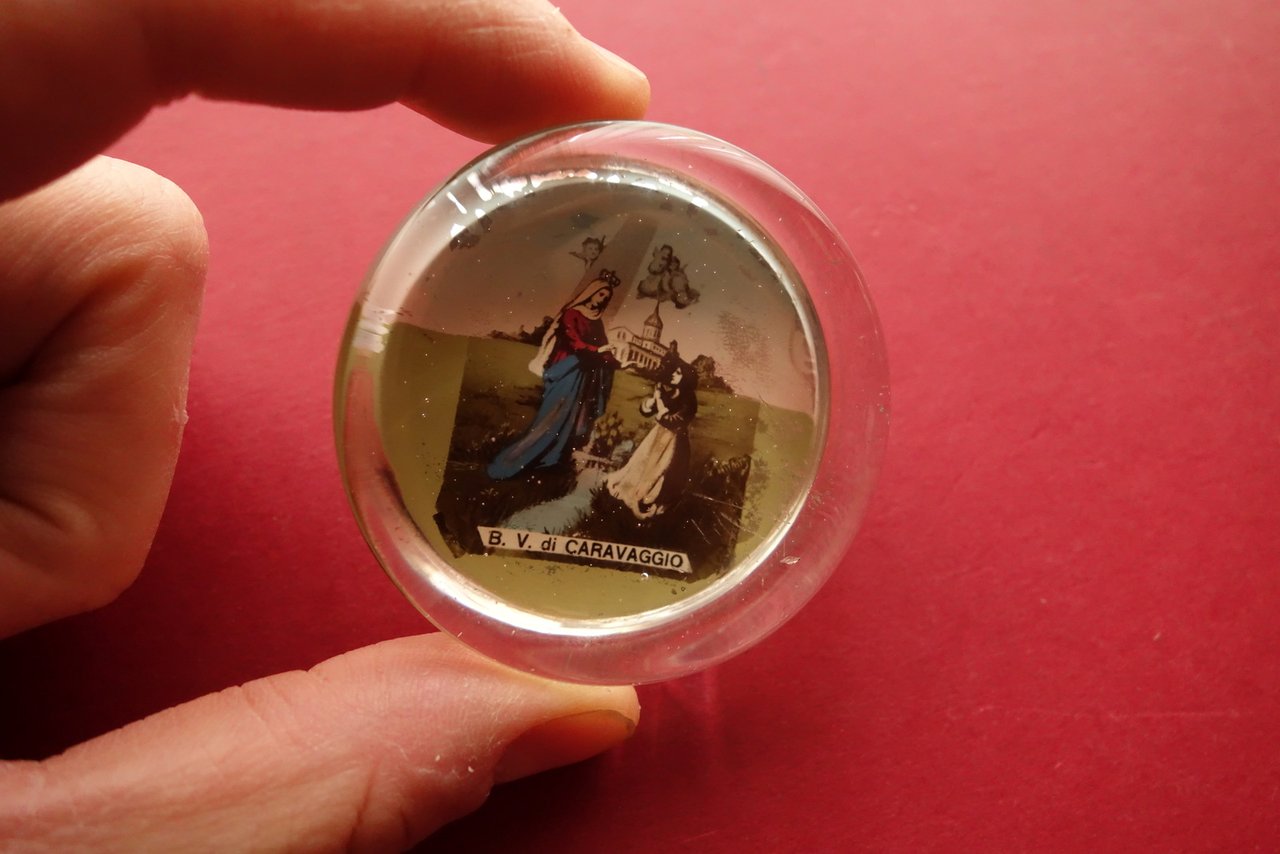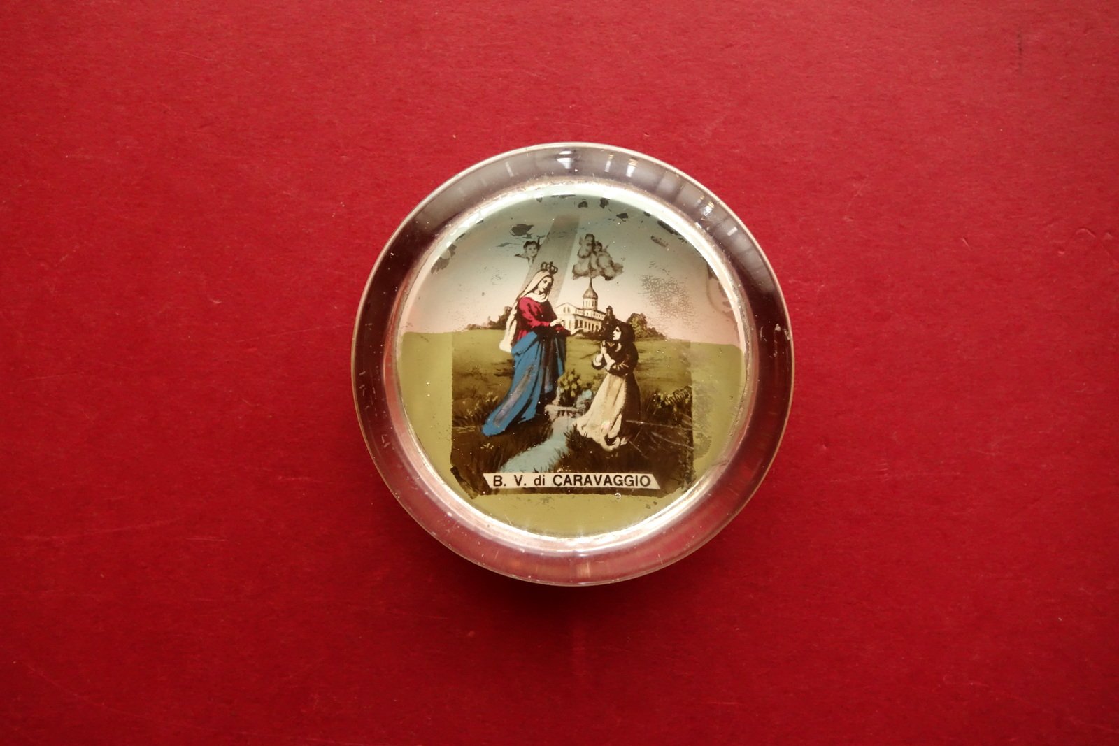 Fermacarte in vetro, Fermacarte in vetro B. V. di Caravaggio con bella illustrazione cromolitografica che reca alcuni piccoli inserti in madreperla primo '900 S. d. ma primo '900 circa; fermacarte in vetro di forma circolare, con all'interno bella illustrazione cromolitografica recante alcuni piccoli inserti in madreperla; diametro cm 5,5. Condizioni di conservazione Buone condizioni con leggere tracce d'uso, alla parte superiore qualche piccolo graffietto e segno di usura (vedi foto). SC04.D0438 N