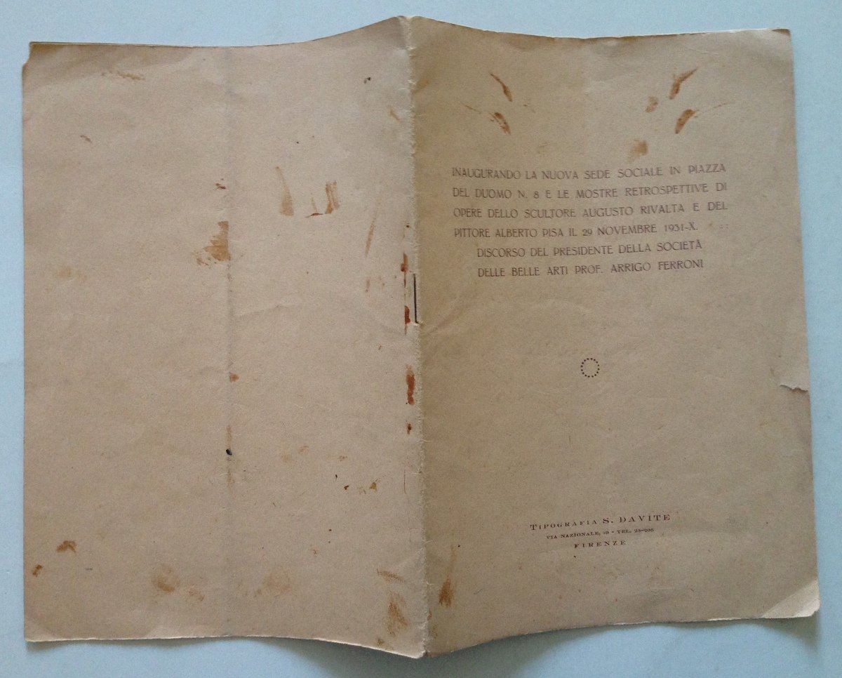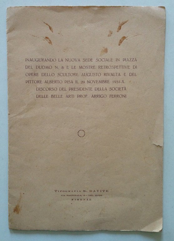 Opuscolo, Inaugurando la nuova sede sociale in Piazza del Duomo n.8 e le mostre retrospettive di opere dello scultore A. Rivalta e del pittore A. Pisa Tip. S. Da Vite, Firenze 1931, cm 24.5x17, pp. 14, inaugurando la nuova sede in Piazza del Duomo n.8 e le mostre retrospettive di opere dello scultore A. Rivalta e del pittore A. Pisa il 29 novembre 1931, discorso del presidente della Società delle Belle Arti prof. Arrigo Ferroni, br. ed. Condizioni di conservazione Esemplare in buone condizioni con tracce d'uso e con qualche brunitura; brossura editoriale con una piega di apertura, minime pieghette e strappetti agli angoli, ai margini e al dorso e con qualche macchia di sporco. OPEB.3243 MT