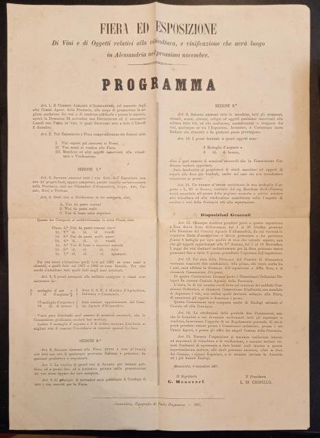 FIERA ED ESPOSIZIONE DI VINI E DI OGGETTI RELATIVI ALLA VITICOLTURA, E VINIFICAZIONE CHE AVRA' LUOGO IN ALESSANDRIA NEL PROSSIMO NOVEMBRE. Programma.