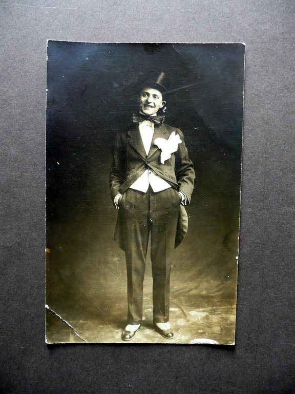 Fotocartolina in b/n, Attore - clown - fotocartolina in bianco e nero anni '20 del Novecento circa S. d. (anni '20 del Novecento circa); fotocartolina originale ill. in b/n; viaggiata. Cm 9x14. Condizioni di conservazione Esemplare complessivamente in buono stato con tracce d'uso, margini con qualche piccolo difetto e, a quello inf., un paio di minuscoli strappetti; un angolo inf. con tracce di pieghette. SC03.D13137 N