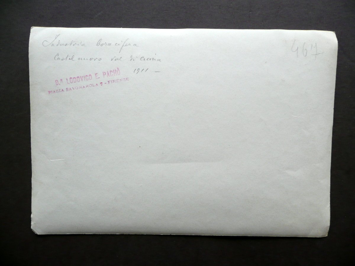Fotografia originale, Industria boracifera Castelnuovo Val di Cecina 1911 Foto Dr. Lodovico e Pachò - Piazza Savonarola 7, Firenze Foto Dr. Lodovico e Pachò, Firenze 1911; fotografia originale d'epoca; al retro brevi note descrittive a matita del precedente collezionista e timbretto recante i dati del fotografo. Cm 11,5x16,5. Condizioni di conservazione Esemplare ben conservato con leggeri segni del tempo, minime ondulazioni, angoli con lievi tracce / accenni di piccole pieghette. SC03.D12660 N