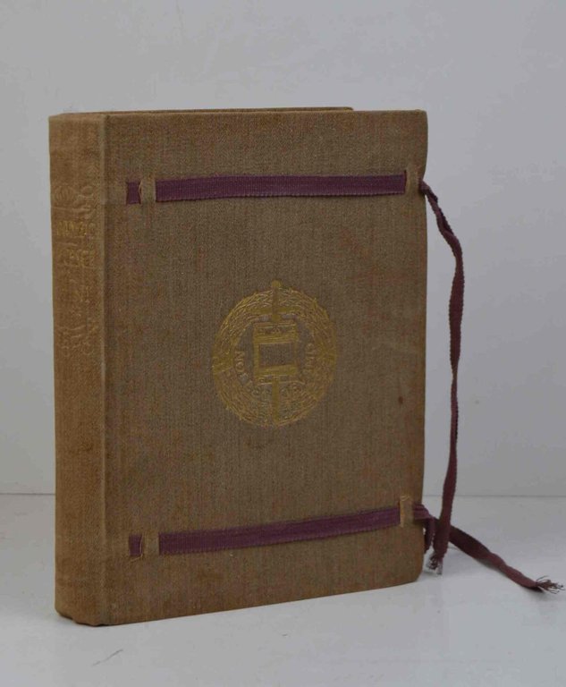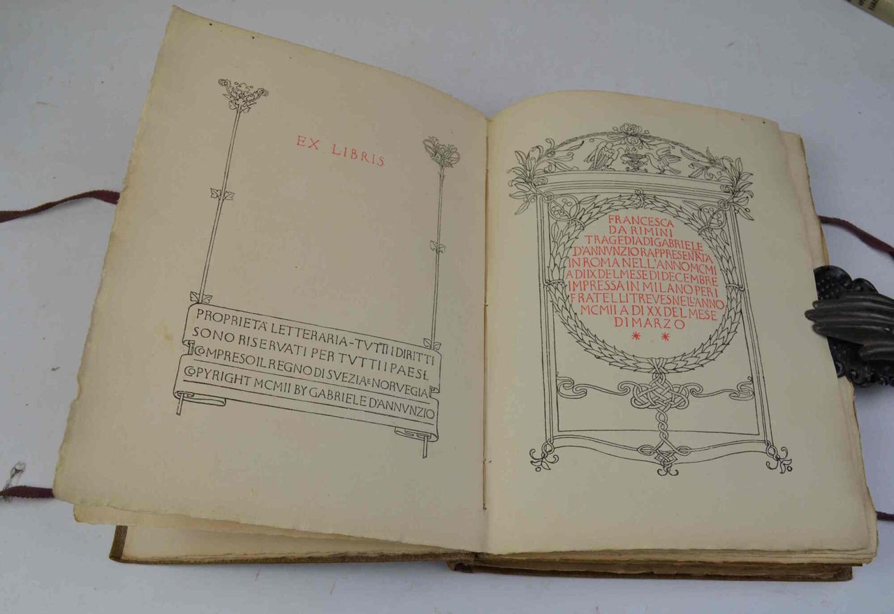 Cm. 23,5, pp. (16) 289 (7). Leg. orig, in piena pergamena con titoli e fregi in oro. Laccetti di chiusura intatti. Esemplare ben conservato. Ex libris. Edizione originale, rara e tipograficamente bellissima. Fu curata e concepita direttamente da D'Annunzio e impressa su carta a mano con barbe, in caratteri rinascimentali rossi e neri appositamente fusi. Ricca è pure la serie di disegni incisi in legno da De Carolis, tra cui le 7 pagine di musica annotata del Maestro A. Scontrino.