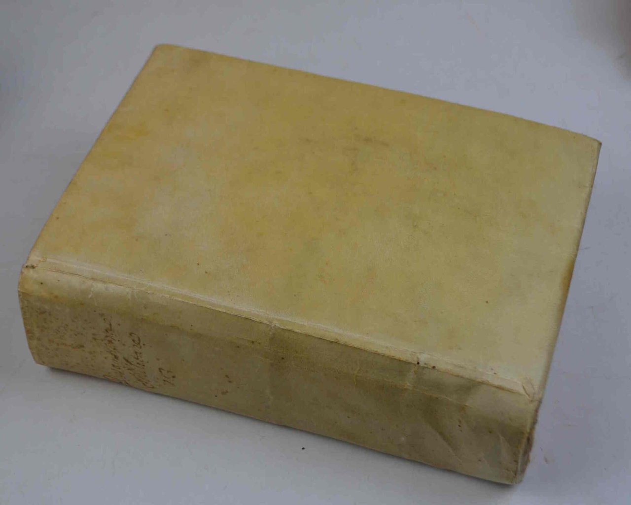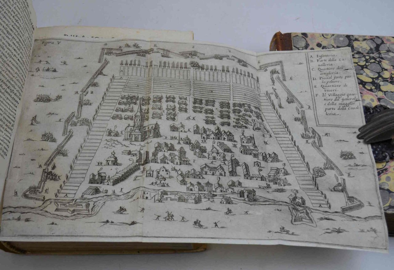 Cm. 22,5, pp. (40) 140 (2) 141-264 (2) 265-328 (2) 329-374 (6) 379-911 (1) (28) 156. Con bell'antiporta figurata, un'incisione a piena pagina e cinque tavole ripiegate fuori testo. Perfetta legatura coeva in pergamena floscia con nervi passanti e traccia di titolo manoscritto al dorso. Esemplare genuino ed assai ben conservato. Opera che presenta una raccolta di sei testi di arte militare questa importante raccolta di opere di carattere militareche reca all'occhietto il titolo di "Disciplina universale dell'arte militare". Le opere contenutevi (ciascuno con proprio frontespizio) sono le seguenti: 1. BRANCACCIO L.: I carichi militari. Del Soldato. Del Sergente. Dell'Alfiero. Del Capitano d'Infanteria. Del Sergente Maggiore. Del Maestro di Campo Generale. Del Capitano Generale della Cavalleria. Del Capitano Generale dell'Essercito. Dell'obbligazione del Principe. 2. MELZO F. : Regole militari sopra il Governo, e Servitio particolare della cavalleria. 3. BASTA G.: Il mastro di campo generale. 4. VALDES, F.: Specchio e disciplina militare nel quale si tratta dell'officio del Sergente Maggiore. Nuovamente tradotto dallo spagnolo in italiano da Gio. Paolo Gallucci. Con un dialogo dell'istesso intorno al formare uno squadrone di gente, & di terreno. 5. BASTA G.: Del governo della cavalleria leggiera. Trattato originale utile a Soldati, giovevole à Guerrieri, et fruttuoso à Capitani, et curioso à tutti. Nel quale si tratta dell'Alloggiare la Cavalleria. Del Marchiare della Cavalleria. Del modo di ordinarla, e governarla per Combattere contra altra Cavalleria leggiera. 6. COLOMBINA GB.: Origine, eccellenza dell'arte militare, et il modo di far salnitro et la polvere. 7. CERVELLINO E.: Militar disciplina. Fondamento reale della radice Quadra, in cui sono diverse Battaglie, da quali se ne cava Battaglia Quadra d'Homini; Battaglia Quadra di Terreno; Battaglia Doblata. Et anco hassi principio di Fortificazione, con altre regole Militari, quali appartengonsi sapere da ogni Condottiere. per rendere buon conto delle loro attioni. 8. SCIALBAN: Il bombardiero veneto esaminato dal suo generale. 9. GALLO F.: Regole di squadroni di fanteria. 10. PICCININO SPADINO F: Modo breve e facile per formare Squadroni sino al numero di 20000. Picche. Con l'esempio del qual numero si può ridurre in Battaglia ogni grande esercito in più Battaglioni. 11. CHINCHERNI A: Lo Scolare bombardiere ammaestrato di Cento cinquanta Istruzioni di conoscere e tirare con l'Artiglieria e molte altre cose concernenti alla professione di Bombardiere.12. SARDI P.: Il Capo de' Bombardieri essaminato, et approvato dal Generale d'Artiglieria.