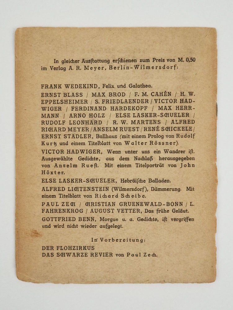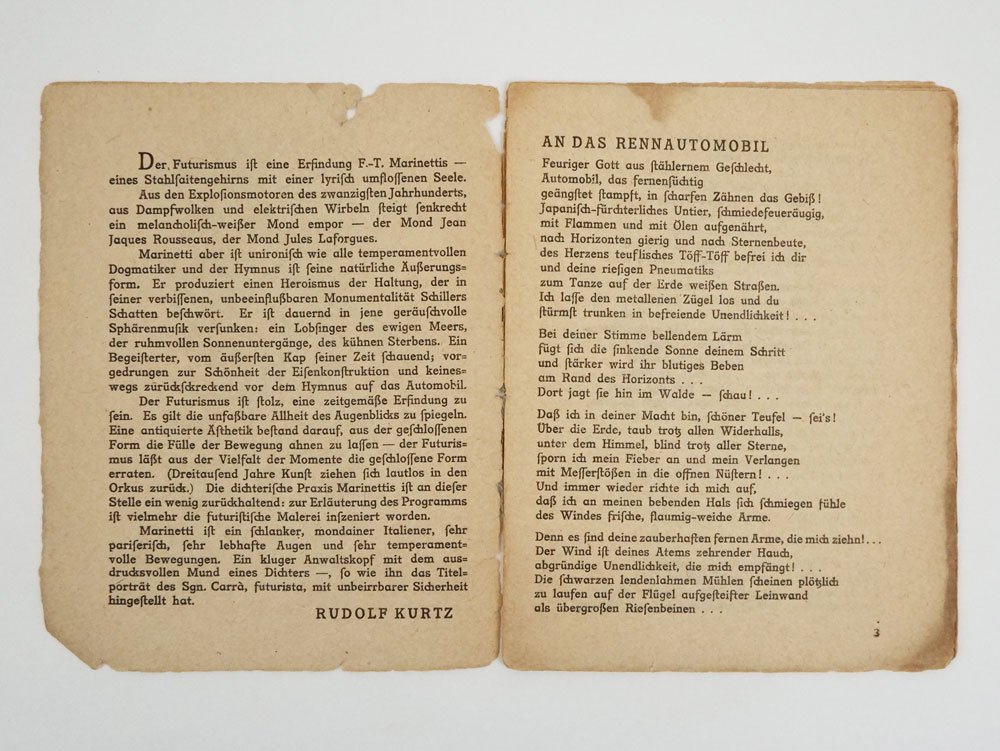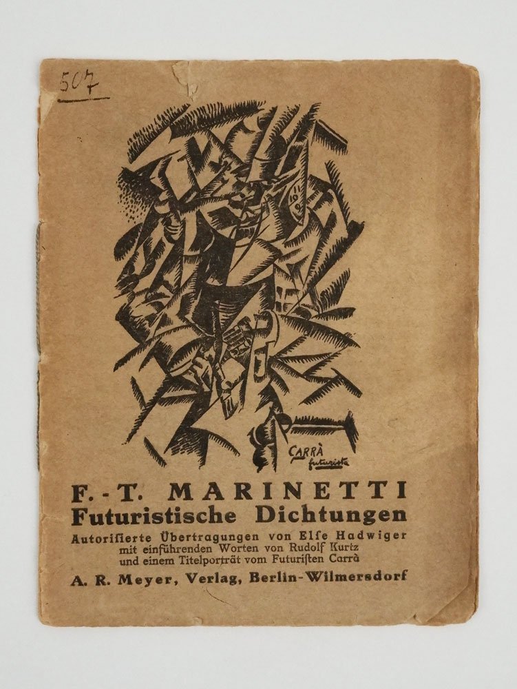 LIBROPrima edizione.Copertina brunita e un po’ gualcita ai bordi, con piccole mancanze, un appunto manoscritto in testa e parziale distacco lungo le cerniere; ma il bel disegno di Carrà si presenta intatto e il fragile reperto in complessive più che buone condizioni.Primo libro di Marinetti in Germania, «la prima antologia in lingua tedesca col bel ritratto di Marinetti realizzato da Carrà venne prefata da Rudolf Kurtz. Lo stesso testo venne pubblicato a pagina 218 del n. 136-137 / 1912 [di «Der Sturm»]» (cat. Futurismo Gorizia 2009, p. 215a). Raccoglie e traduce una manciata delle più moderne poesie versolibere del fondatore del futurismo: «All’automobile da corsa»; «La sera e la città»; «La fanfare delle onde»; «Contro i sillogismi»; «Inno alla morte».Cammarota, Marinetti, 38; Fanelli-Godoli, Il Futurismo e la grafica, p. 87; Hulten, Futurismo & Futurismi, p. 427; Futurismo: Filippo Tommaso Marinetti e l’avanguardia giuliana (cat. Gorizia 2009), n. 57