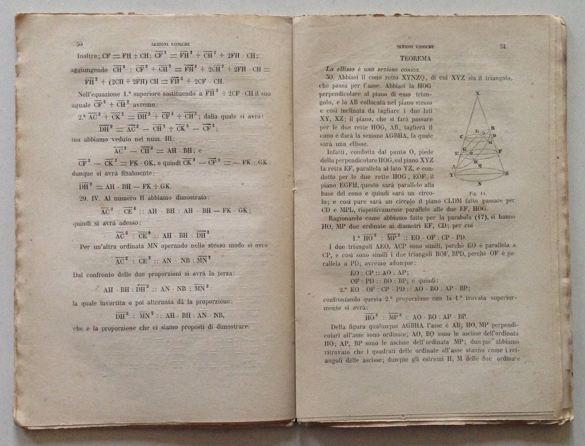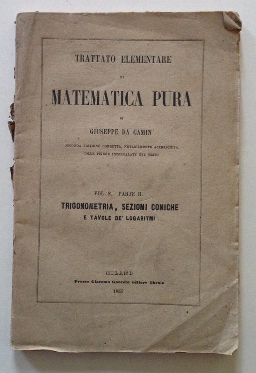 G. Da Camin, Trattato elementare di matematica pura volume 2-parte 2 Giacomo Gnocchi Editore, Milano 1855; cm 22x14.5, pp. 58; con 58 tavv. di logaritmi f.t., seconda edizione corretta, notabilmente accresciuta, figg. intercalate n.t.; vol. 2, parte 2: Trigonometria, sezioni coniche e tavole di logaritmi; br. ed. Condizioni di conservazione. Esemplare in buono stato con tracce d'uso e del tempo; brossura editoriale con alcune pieghette e strappetti, in particolare una mancanza all'angolo superiore brossura posteriore, che coinvolge anche le ultime 2 pagine (vedi foto); dorso con strappetti e mancanze, fessurato; interni compatti. OPEB.3786 MT